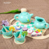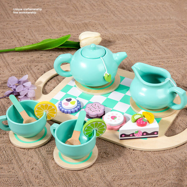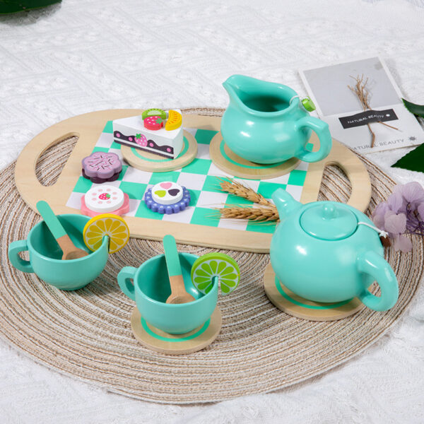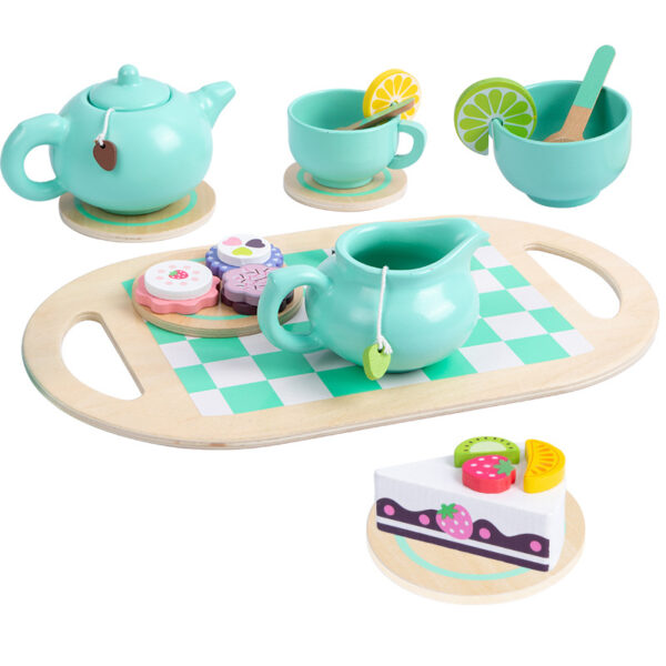- The set includes a tray, a teapot, cups, a creamer, coasters, spoons, pretend tea bags, lemon slices and treats like cookies and a cake slice.Β
