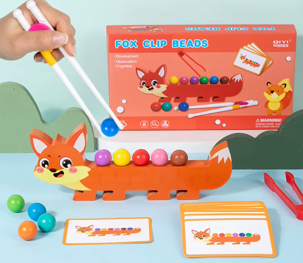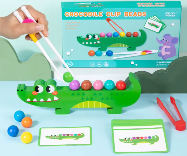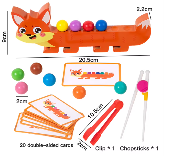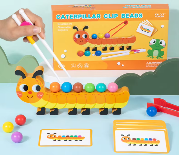 • Fine Motor Skills: Children use tongs or chopsticks to pick up and place small beads, improving hand strength and finger control.