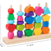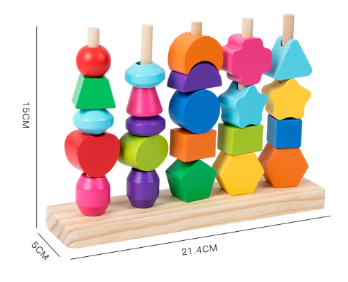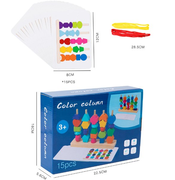 Includes wooden beads, a wooden stand, 2 laces, and 15 double-sided pattern cards for stacking, matching, and threading play. -