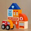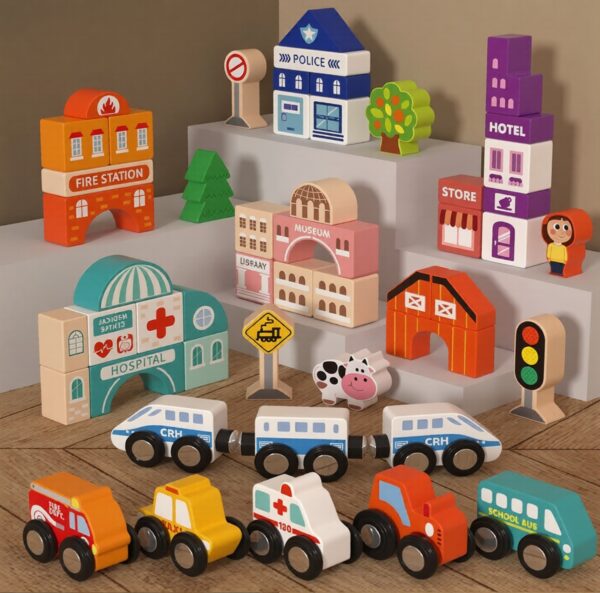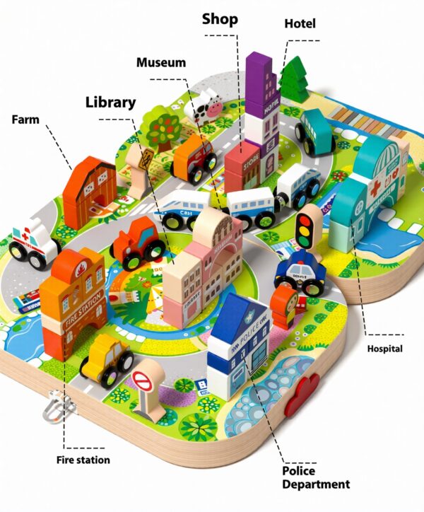 - Design: The set features various wooden pieces, including buildings, vehicles, roads, and trees, allowing kids to construct their own city cityscape.