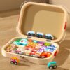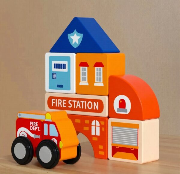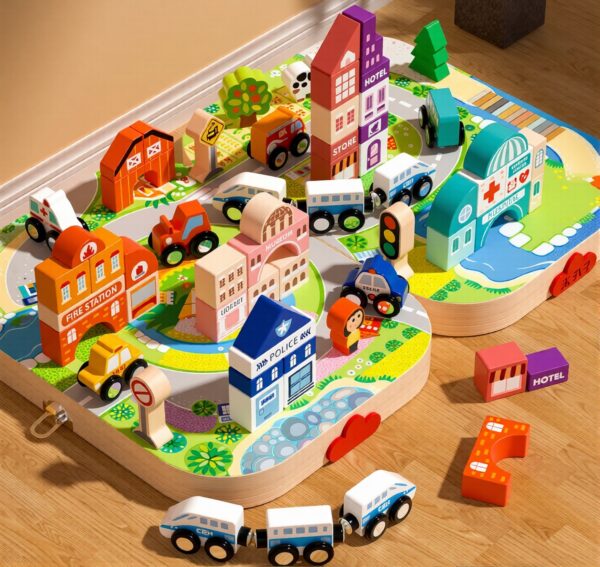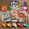 This wooden city block set is a portable, educational toy designed to help children develop cognitive, motor, and social skills through open-ended play.