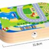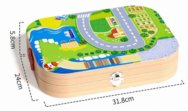 - Portability: This toy comes in a sturdy wooden foldable case that transforms into a city play mat, making it easy to store and carry.