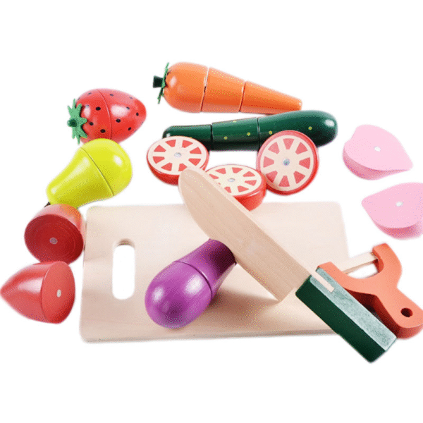Includes various fruits and vegetables, a cutting board, wooden knife, and wooden vegetable peeler